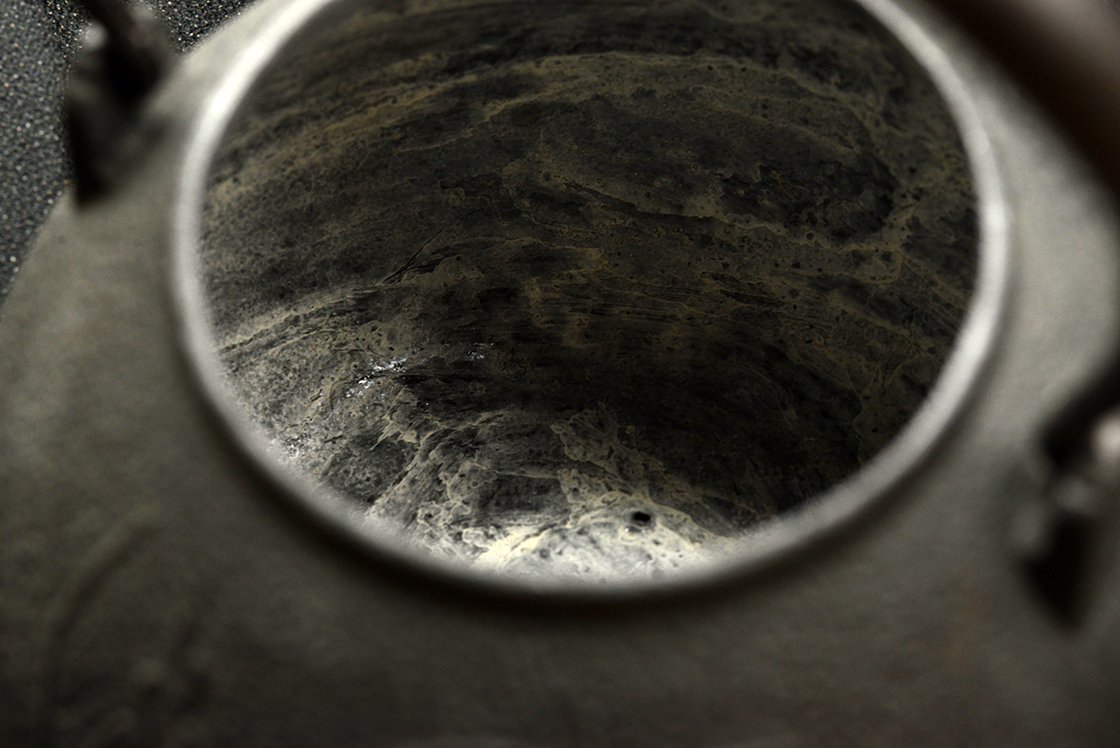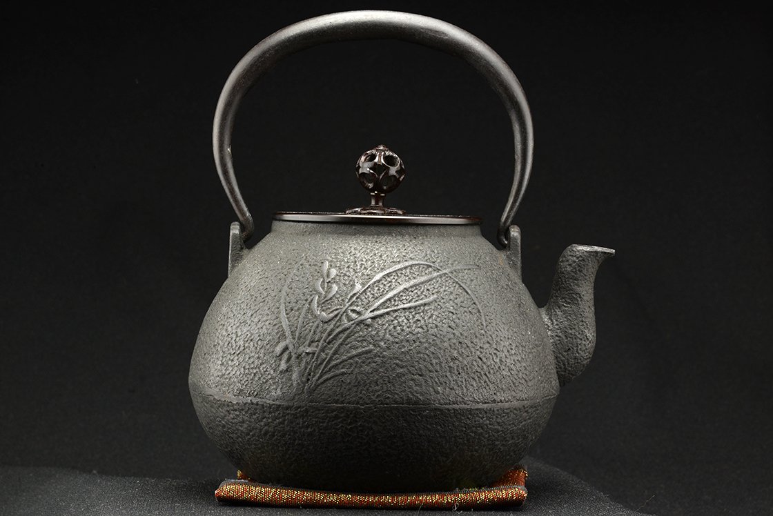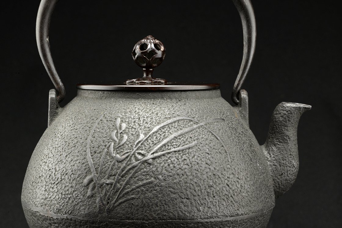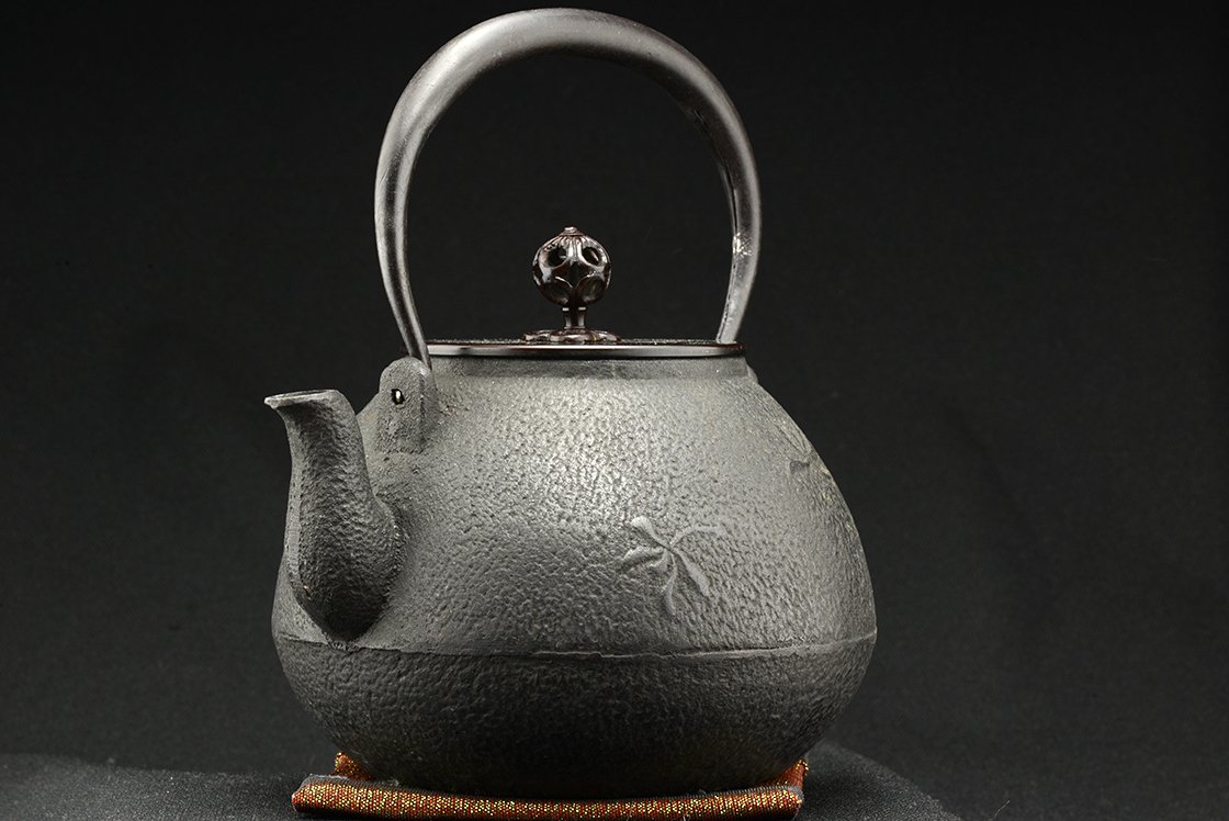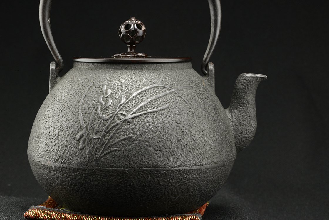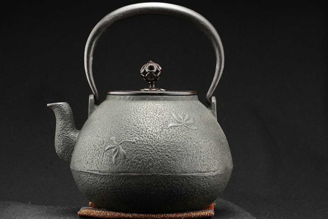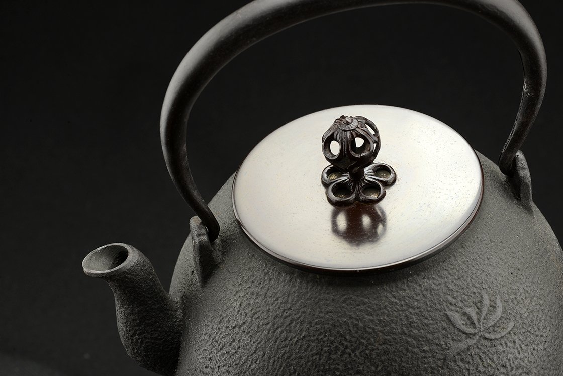 Cho Kan = nagy nyugalom. 1,2 liter űrtartalmú öntöttvas tetsubin bronz és réz fedéllel.