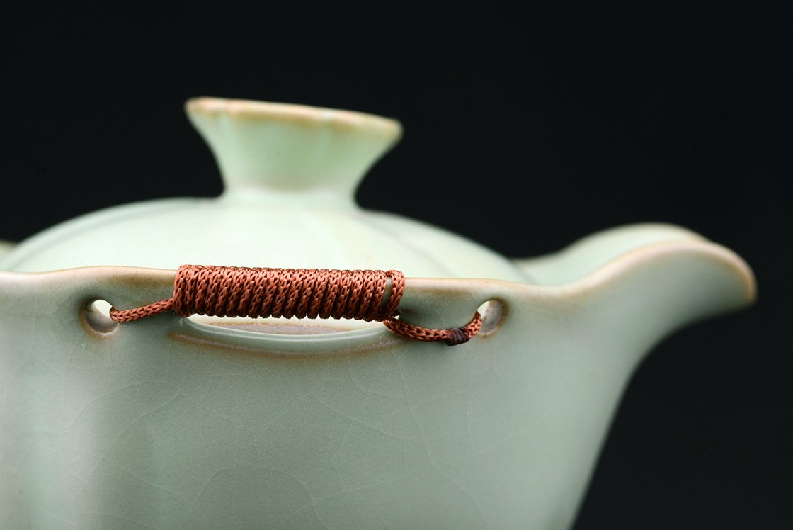 Különleges minőségű Ru Yao celadon gaiwan a ma divatos alacsonyabb kivitelben a fogást megkönnyítő apró részletekkel. „雨过天青云破处 A színe, mint a kék ég eső után.” – mondták erről a celadonról. A Ru, Guan, Ge, Ding, és Jun az öt híres celadon műhely (hagyomány, módszer), ezek közül a mi fogalmaink szerint türkizzöld, krémszínű, selyemfényű celadon a legértékesebb. Ez a celadon máz ugyanúgy mikrorepedések hálózatából áll, ami idővel különleges patinát nyer az elfogyasztott teáktól, ugyanakkor az 1300 Co fölött égetett lényegében porcelánból készült kerámiamáz nagyon ellenálló, nem reped, nem csorbul, sokszor még a leejtést is túléli.