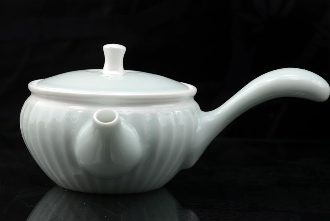 Ennek a teáskészletnek a testvére ez a porcelán celadon mázas inox szűrővel ellátott japán készlet.
