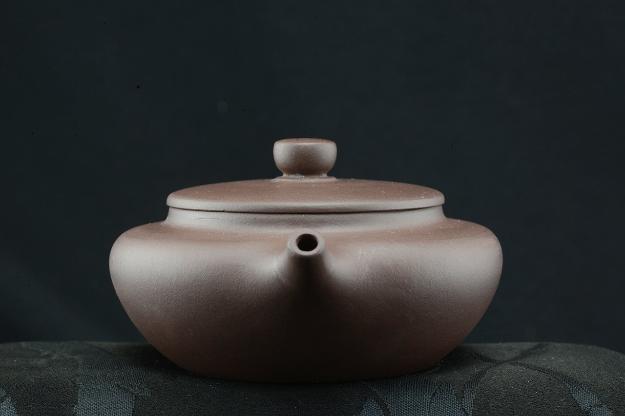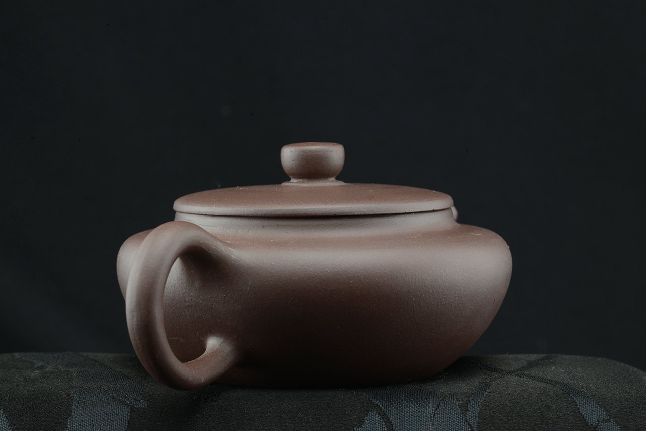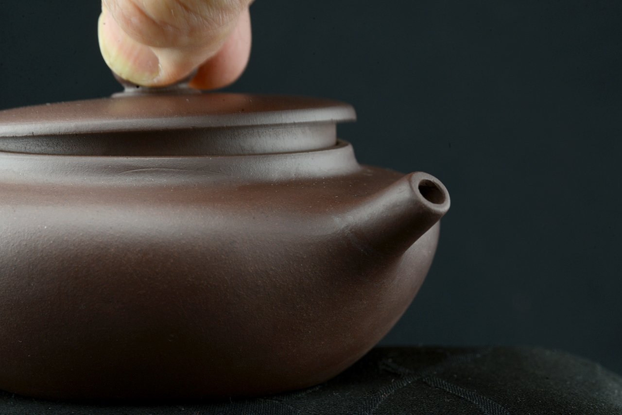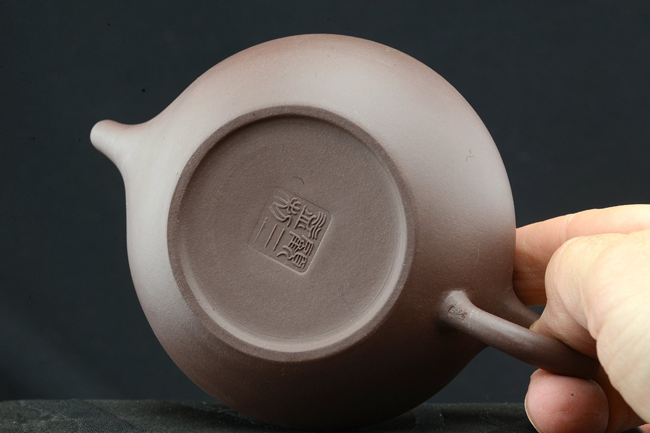 Zi ni 紫泥 kevert bíbor yixing agyagból készült, széles szájú, lapos, modern dizájnú Bian Yun 扁 韵 yixing teáskanna Gu Sanyi műhelyéből. A kanna különösen alkalmas sheng puerh és nagy levelű oolong teák vendégül látására 200 ml űrtartalmú, mérete 15 x 9,5 x 6 cm.