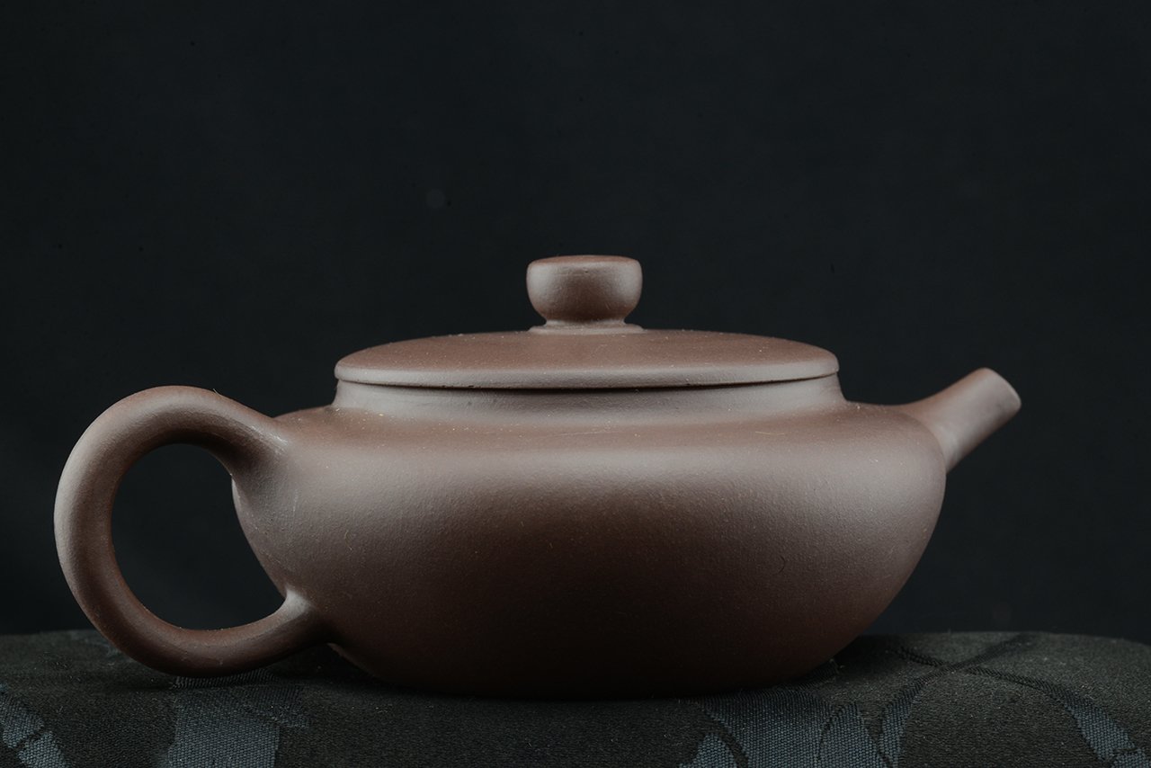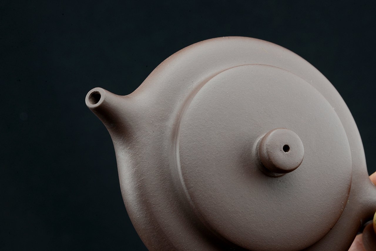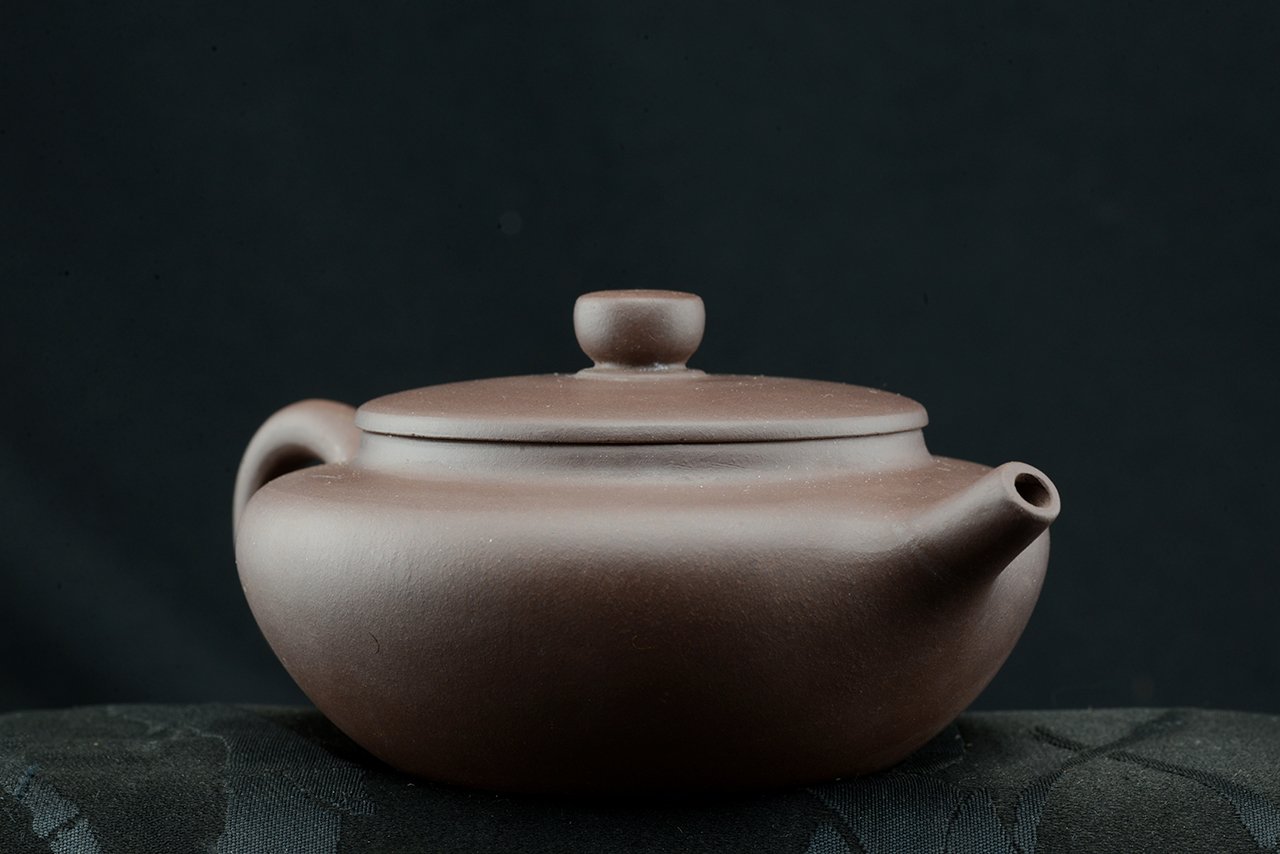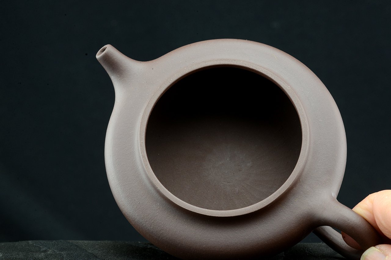 Zi ni 紫泥 kevert bíbor yixing agyagból készült, széles szájú, lapos, modern dizájnú Bian Yun 扁 韵 yixing teáskanna Gu Sanyi műhelyéből. A kanna különösen alkalmas sheng puerh és nagy levelű oolong teák vendégül látására 200 ml űrtartalmú, mérete 15 x 9,5 x 6 cm.