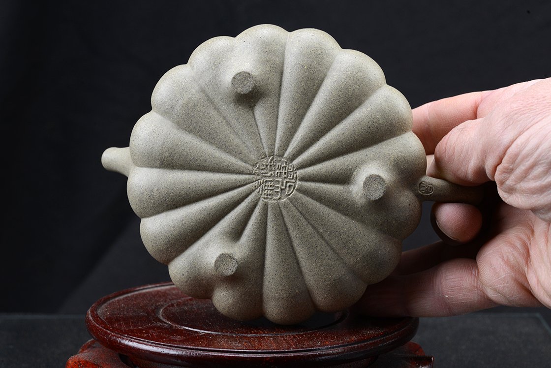 A sokszoros virágszirom alak a kanna készítés egyik legnehezebb műfaja. Az alapforma a „kőedény” shi piao, aminek palástját, falát a megszokott sima fal helyett sokszorosan tagolt szirom alkotja. A motívum a kanna egész testére kiterjed, úgy az aljára, mint a palást peremére, ami mániákus pontossággal fogadja magába a szintén tagolt fedőt. Ezt a nehéz gyakorlatot tök, vagy virágmintában szokták megformázni, de az ilyen sokszoros szirom minta ritka és tényleg nagy mesterségbeli tudást feltételez, ezért is választott a szokásosnál keményebb yixing agyagot hozzá. A kanna belsejében pecsét van, de érdekesebb, ahogy megfigyelhető a kanna palástjának aprólékos belső kiképzése. A belső falon kilenclyukú szűrő.