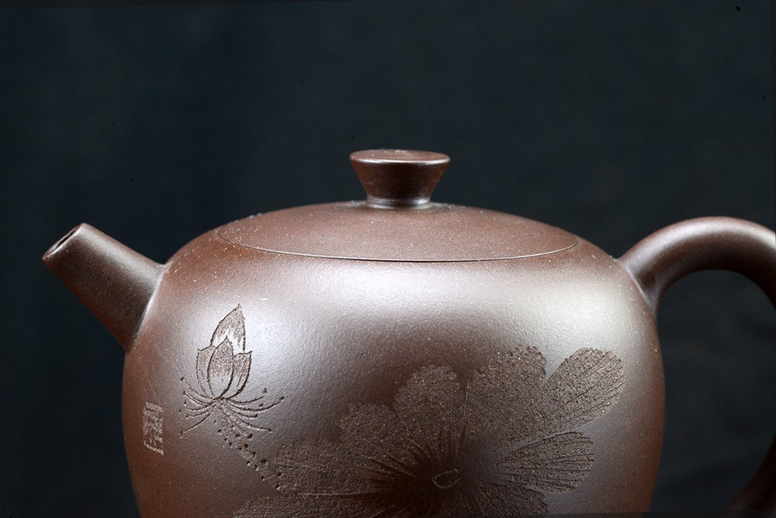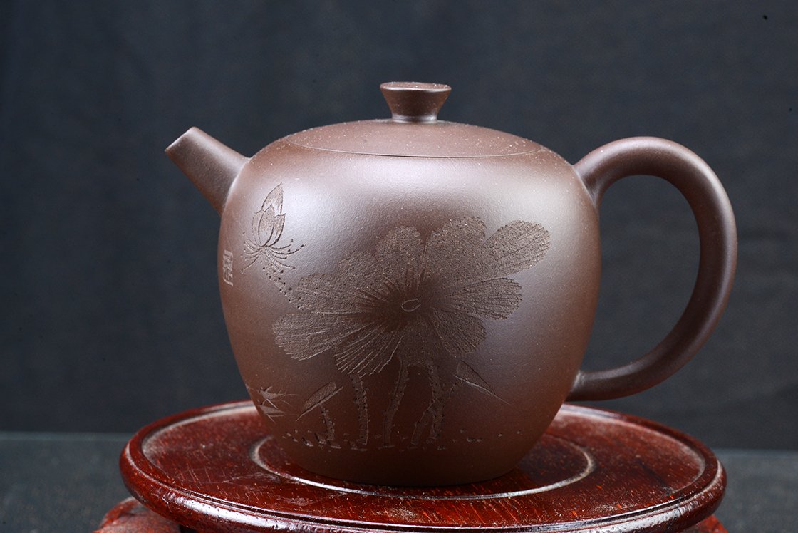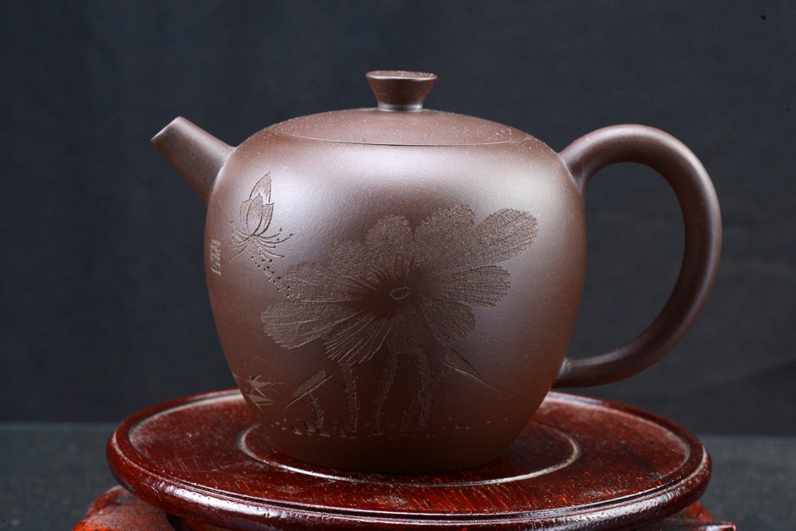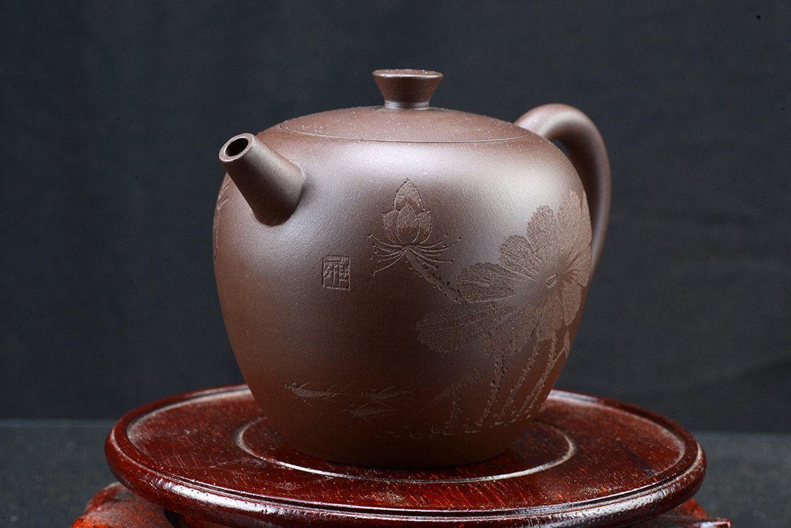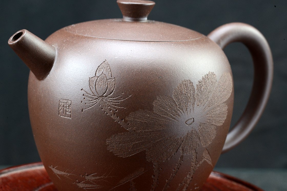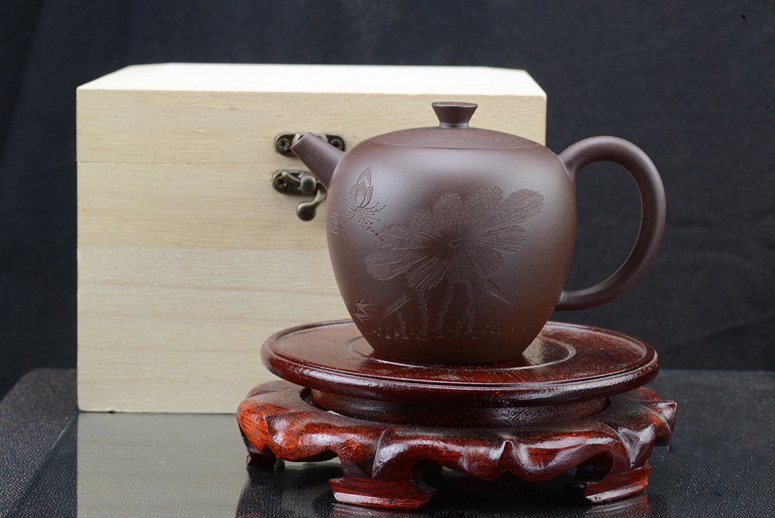 Wang Ting keramikushölgy műhelyébő vésett lótuszmintával. A kanna fa díszdobozban érkezik, törlőkendővel.