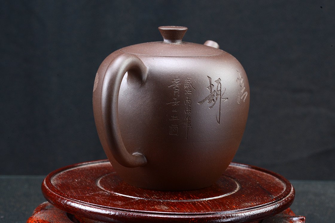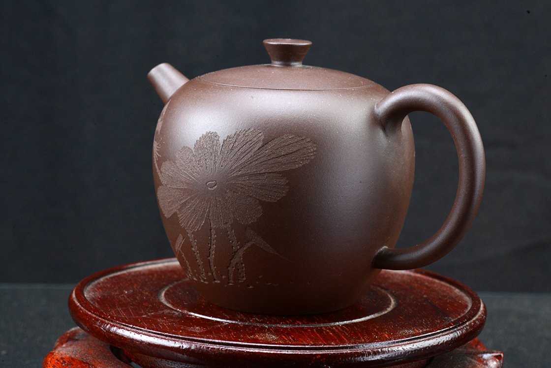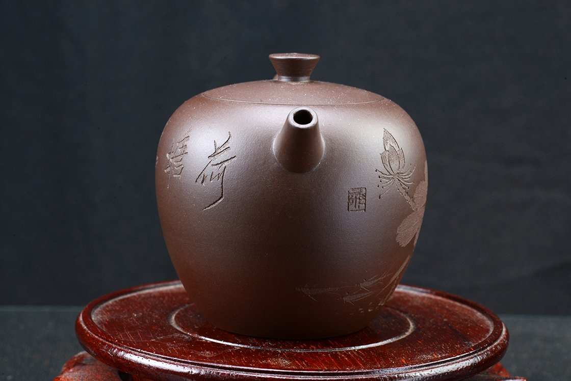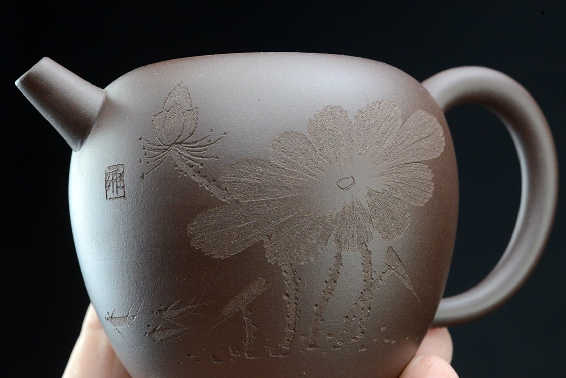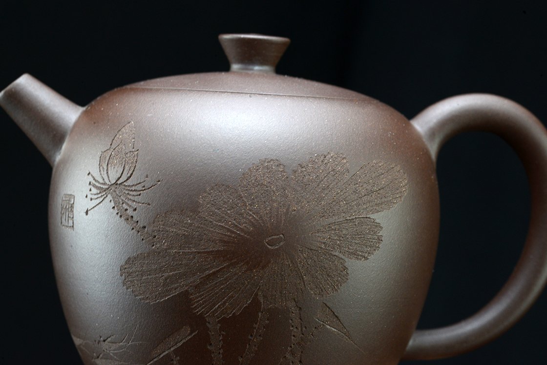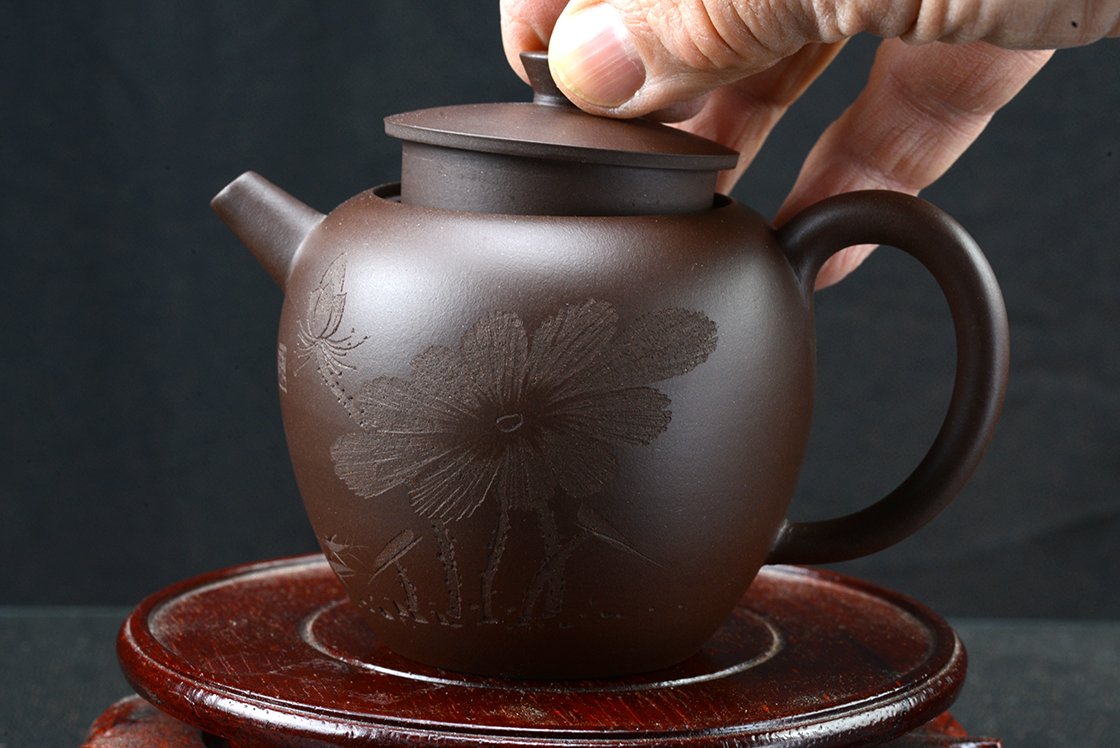 Wang Ting keramikushölgy műhelyébő vésett lótuszmintával. A kanna fa díszdobozban érkezik, törlőkendővel.