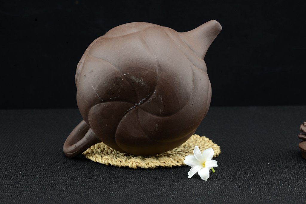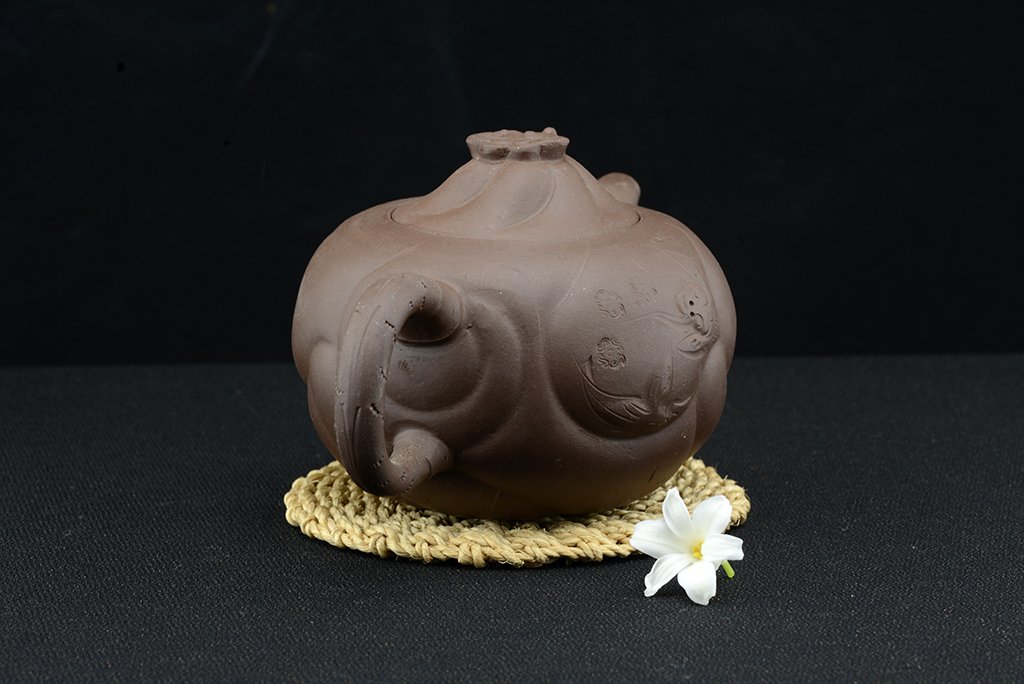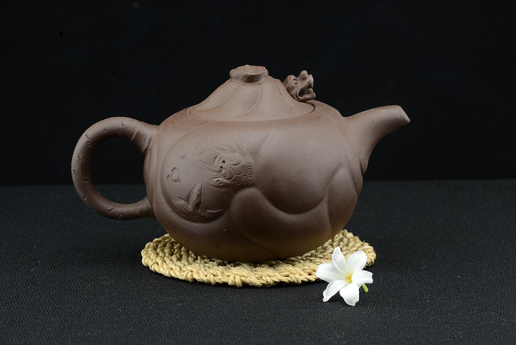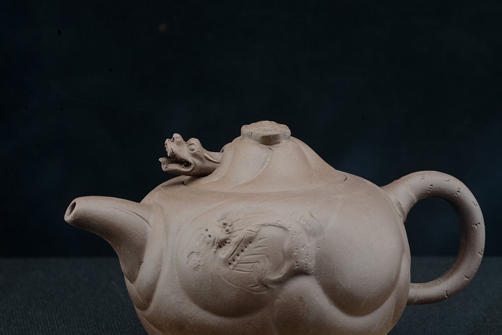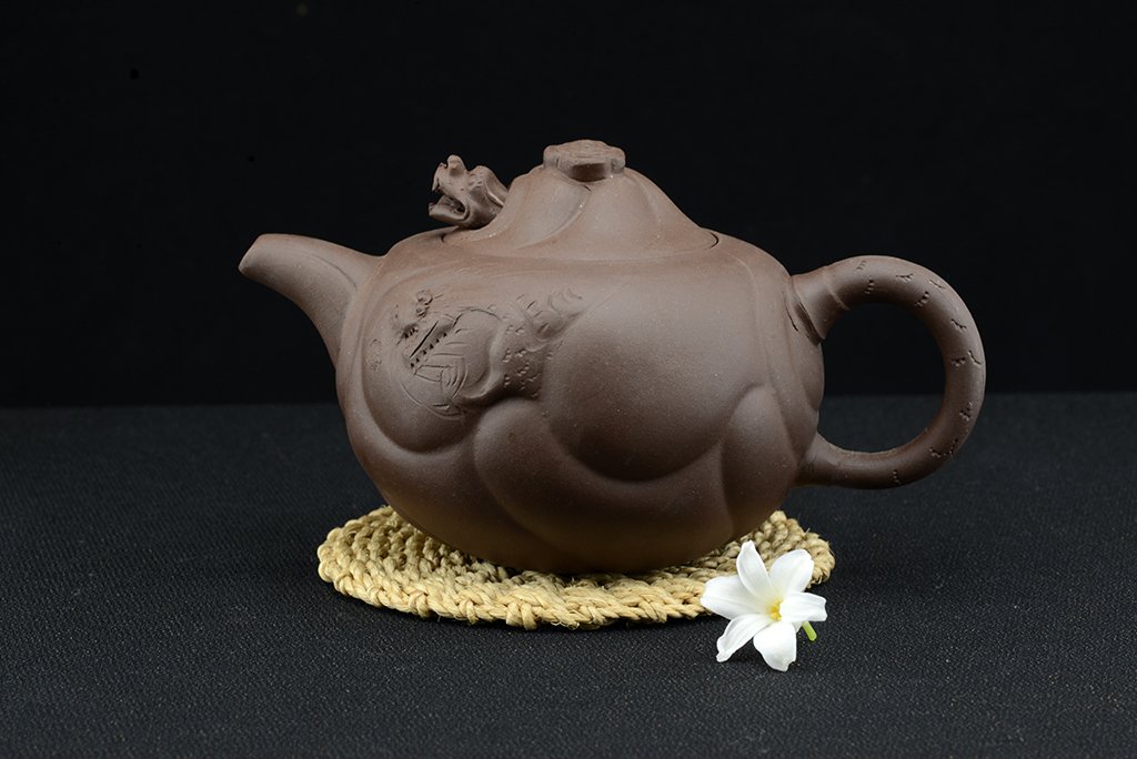 250 m űrtartalmú sötétbarna teáskanna az öntés alatt a tetőből előreugró sárkánnyal.