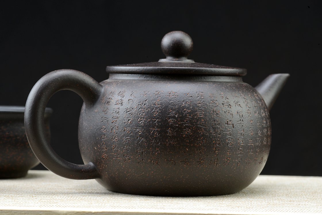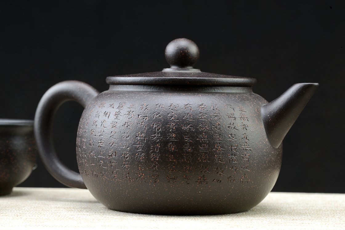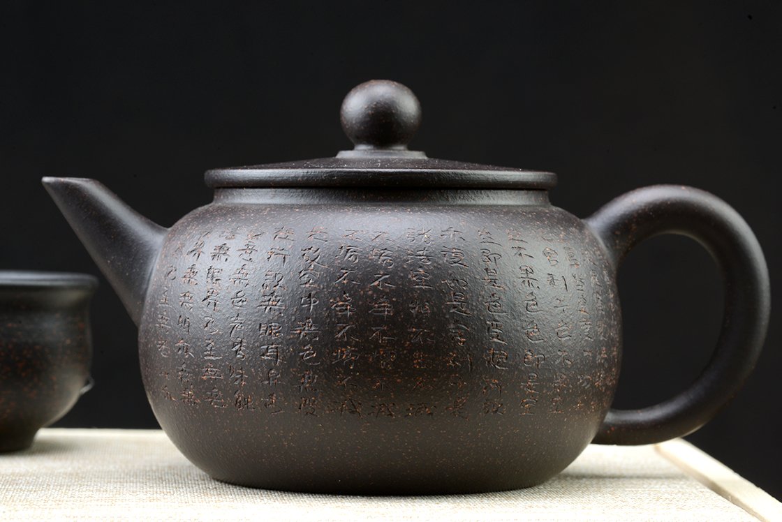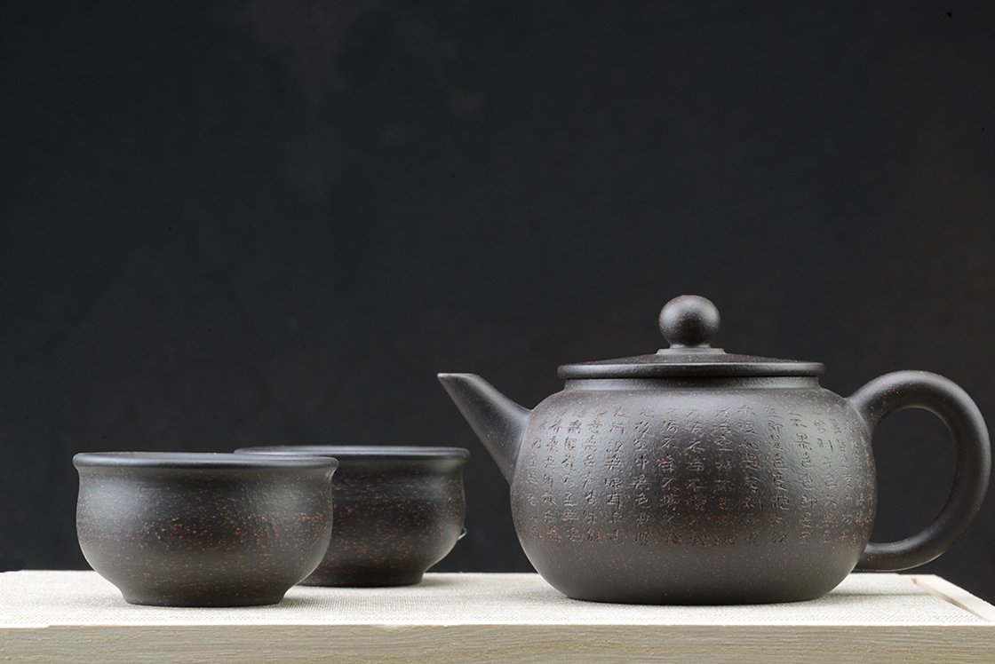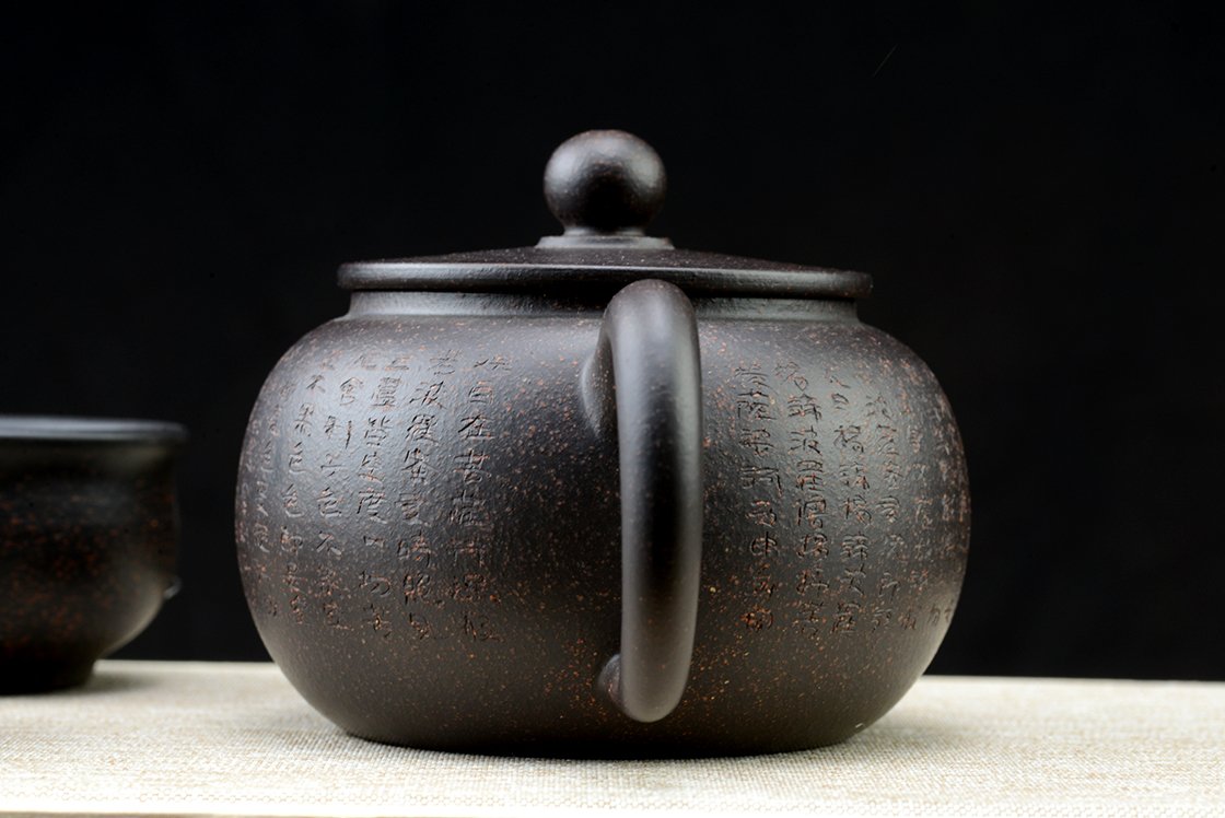 Díszdobozban lakik ez a szutra vésetű yixing teáskészlet Hei Jin Gan kevert fekete yixing agyagból. Törlőkendő, alátét, igazolás jár hozzá. A művész Ma Deliang fiatal yixing keramikus, művei megjelentek a Yixing új korszakát bemutató 五色土新传 c. almanachban