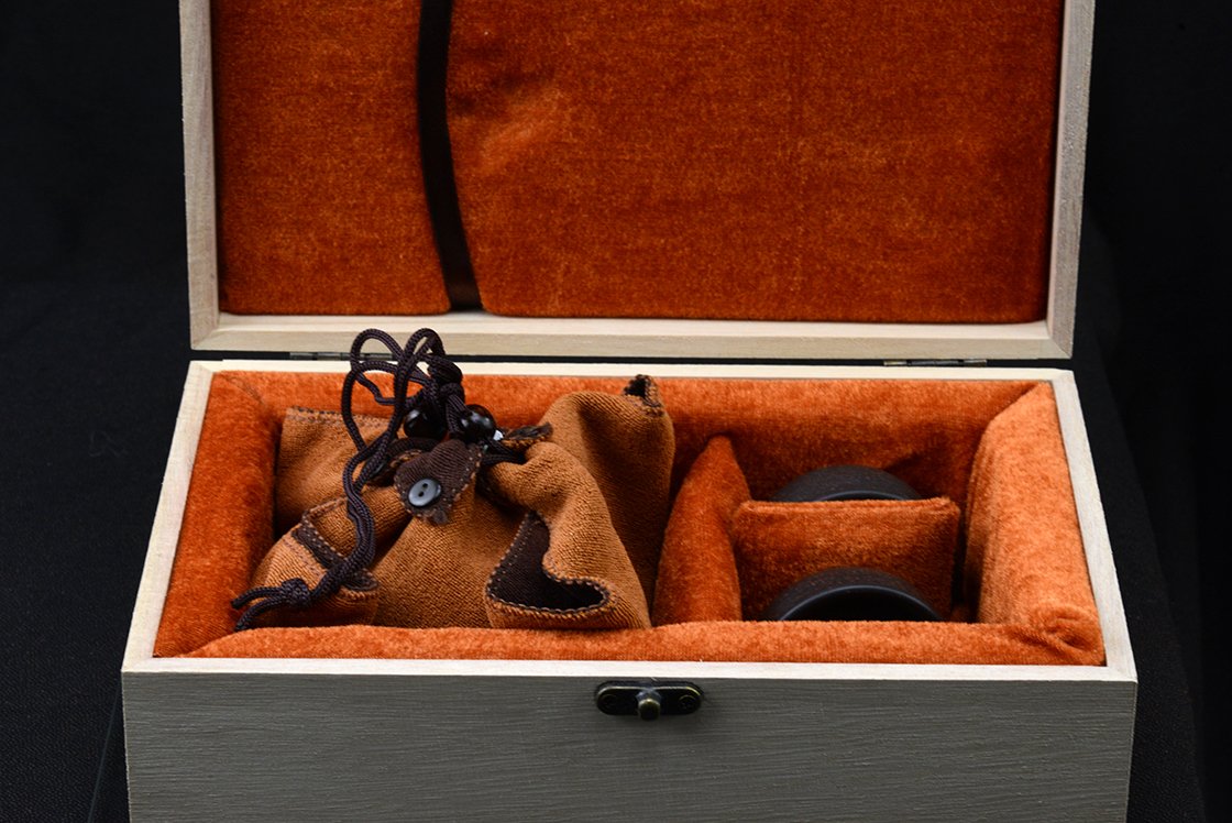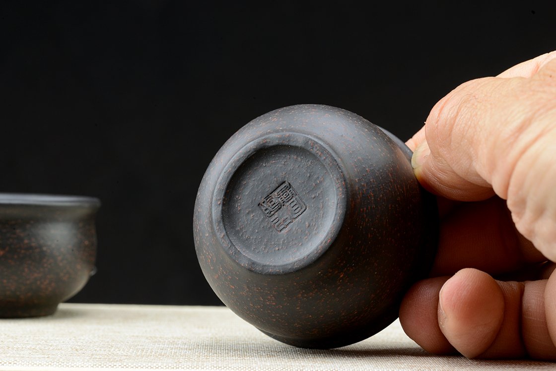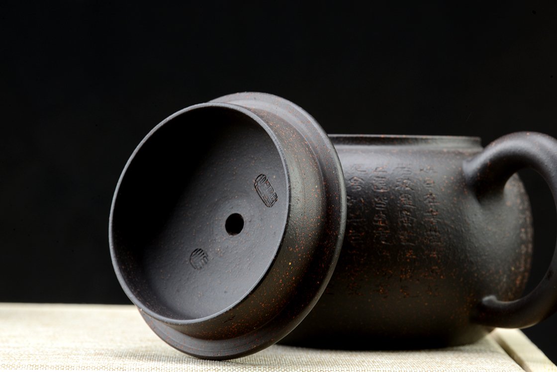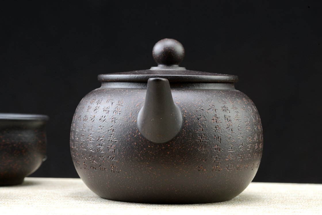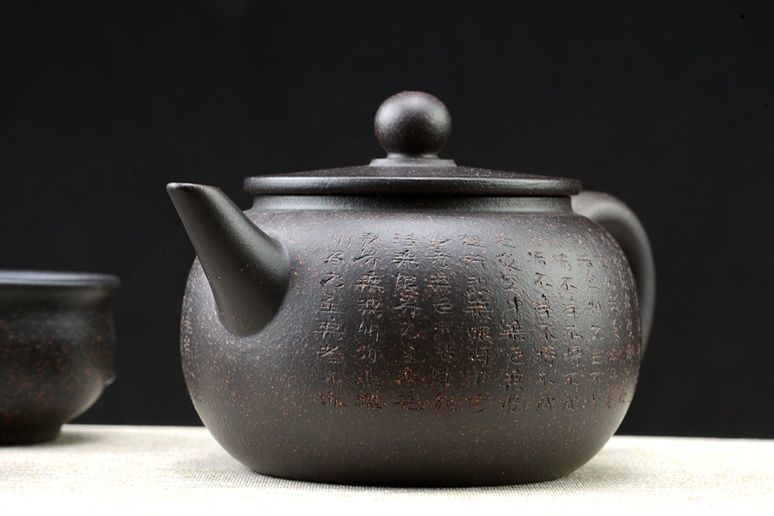 Díszdobozban lakik ez a szutra vésetű yixing teáskészlet Hei Jin Gan kevert fekete yixing agyagból. Törlőkendő, alátét, igazolás jár hozzá. A művész Ma Deliang fiatal yixing keramikus, művei megjelentek a Yixing új korszakát bemutató 五色土新传 c. almanachban