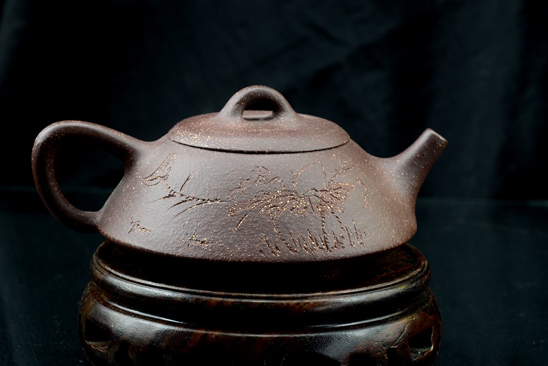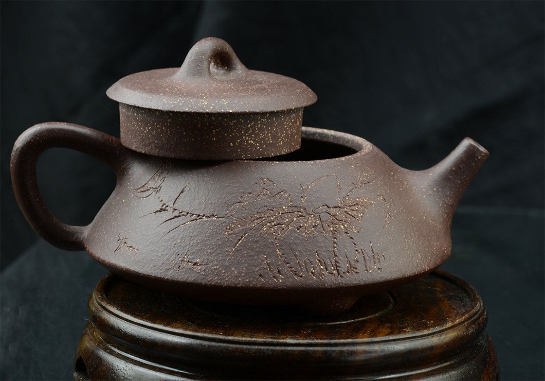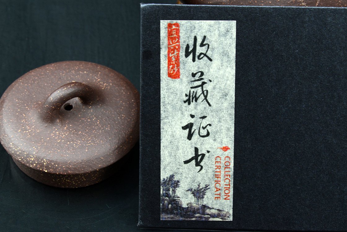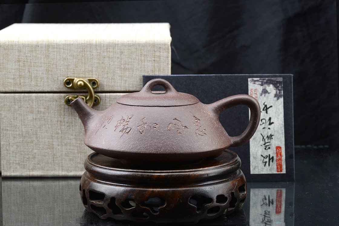 A kanna kevert, szemcsés zi ni agyagból készült Wu Min keramikushölgy műhelyében. A Huang Long Shan bányából származó szemcsés alapanyag jól kiemeli a kannába vésett mintát. Díszdoboz, igazolás, alátét és törlőkendő jár hozzá.