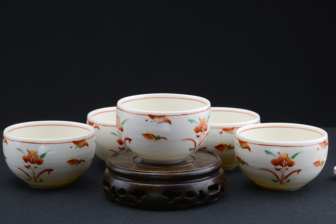 Arita imari porcelán teáscsésze készlet, ami 5 kézzel festett csészéből áll. A csészék átmérője 9 cm, magassága 5,8 cm.