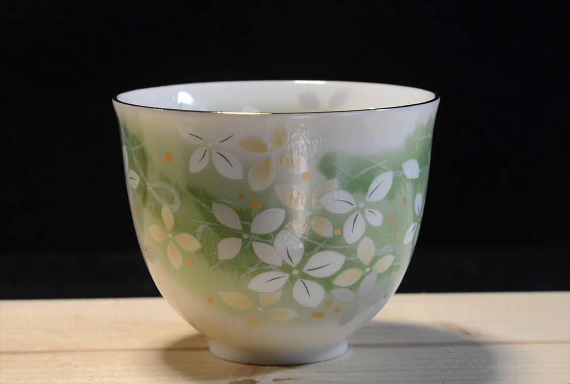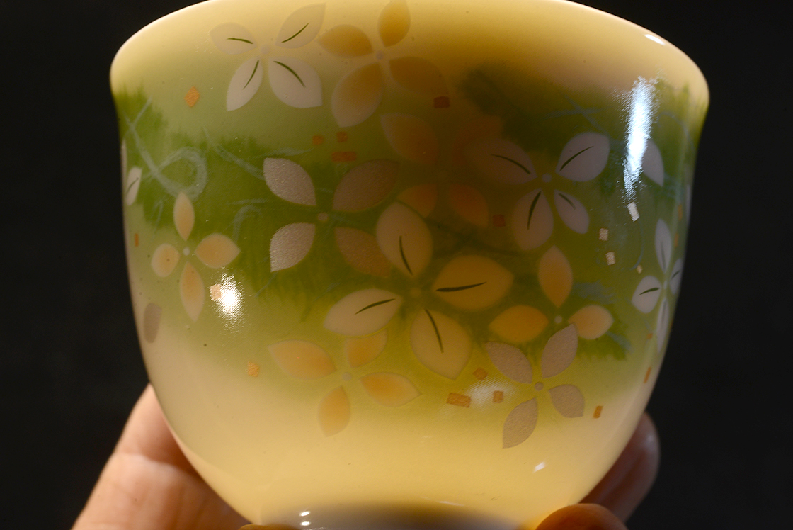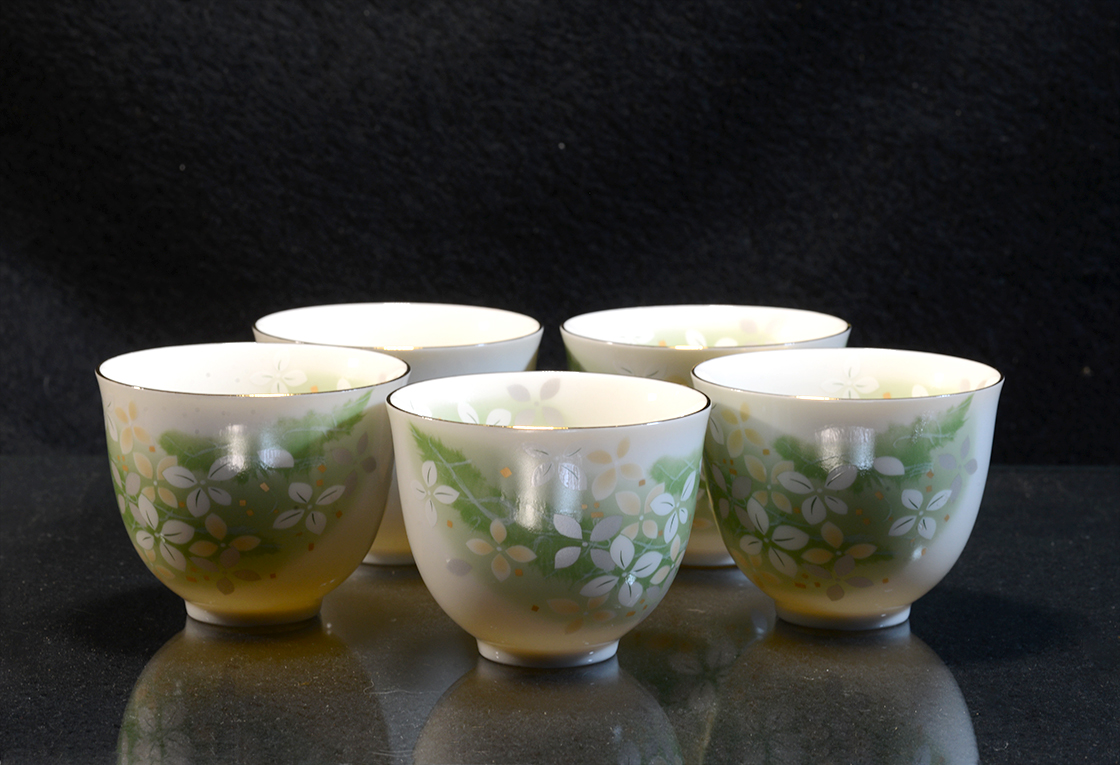 A csészék kézzel festett kyotói finom porcelán csészék, melyeknek átmérője 7,8 cm, magassága 6,3 cm, űrtartalmuk 150 ml.