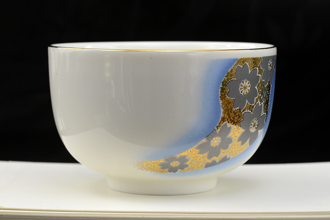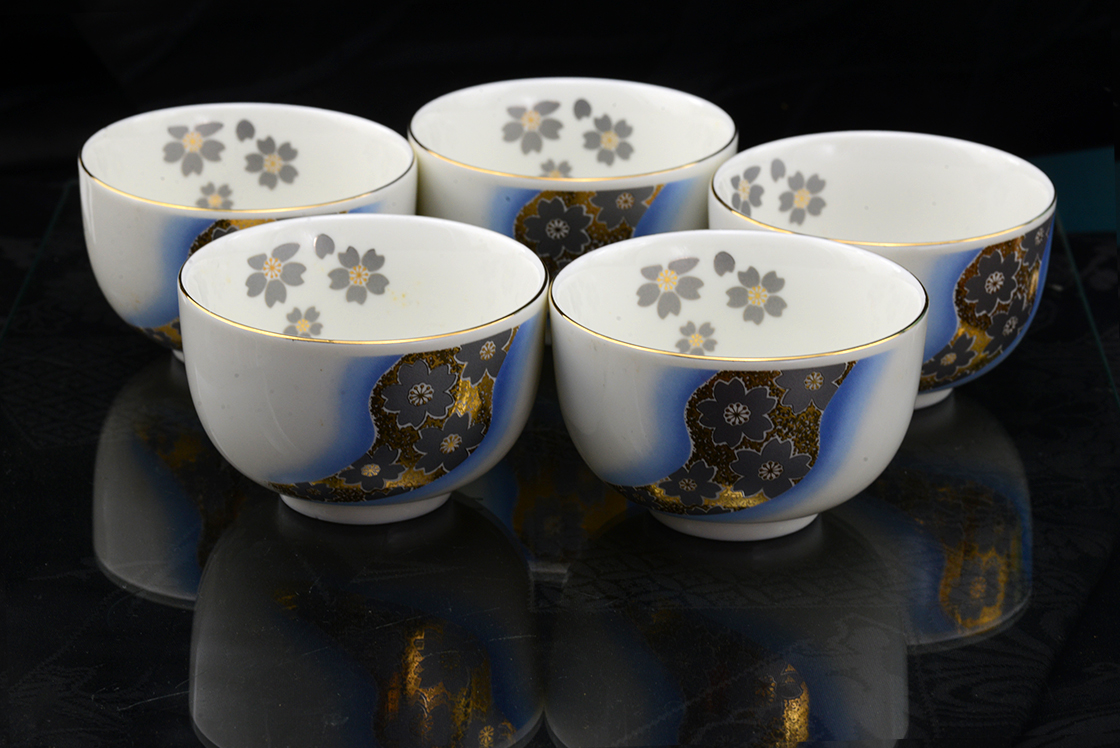 A Hasami kerámia Nagaszaki kerámiája, a XVI. század óta létezik és a többi déli kerámiához hasonlóan nehezen tagadhatja a koreai hatást. Finom porcelán alapon mázazott és kézzel festett, aranyozott minta. A csészék átmérője 8,4 cm, magassága 4,8 cm, az ár az öt csészére vonatkozik.
