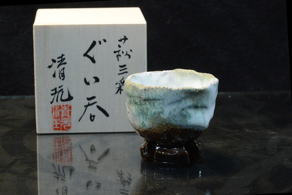 7 cm átmérőjű, 6,5 cm magas három színű (sansai -sancai) csésze. Teáscsészeként is használatos, de eredeti rendeltetése szerint hideg, vagy forró szaké fogyasztására szolgál. A csésze eredeti fadobozában lakik.