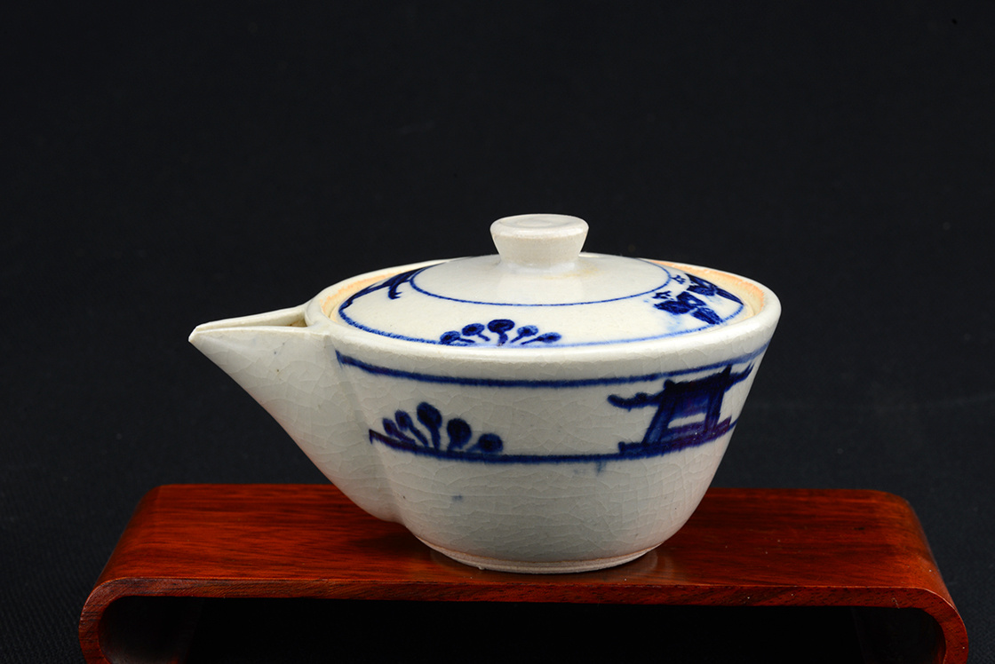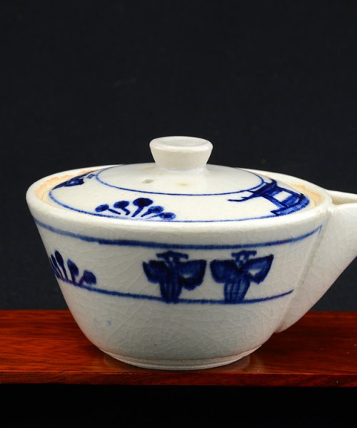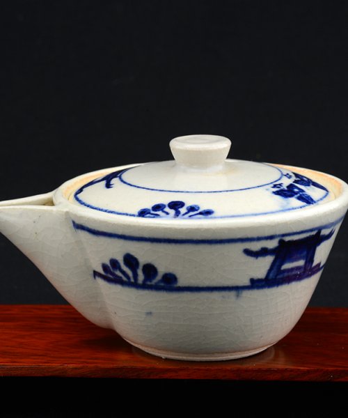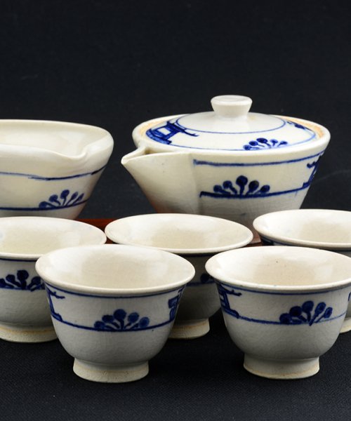 | Akahada japán teáskészlet Gyokusen Oshiuo műhelyéből. A készlet kannája a megszokott japán méret kb 160 ml űrtartalmú, 10 cm átmérőjű, 7 cm magas. Az Akahada kerámia Nara kézműves kerámiája, amit 1573-ban alapított a rettegett nagyúr Hideyoshi öccse Hidenaga Toyotomi. Az alapanyaga jó minőségű, nagy vasoxid tartalmú agyag. A kerámia neve Akahada Yama épp ezt jelenti, "a felszínre bukkanó vörös domb". Mindig kézzel festett, absztrakt mintákat alkalmaznak. A kanna csőre nagyon finom, pontos munka. |