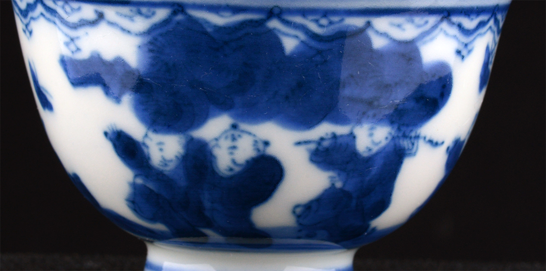 A csészék a japán porcelán arisztokratikus, nemes Nabeshima porcelán csészék, kézzel festve. Átmérőjük 6,3 cm, magasságuk 4,5 cm.