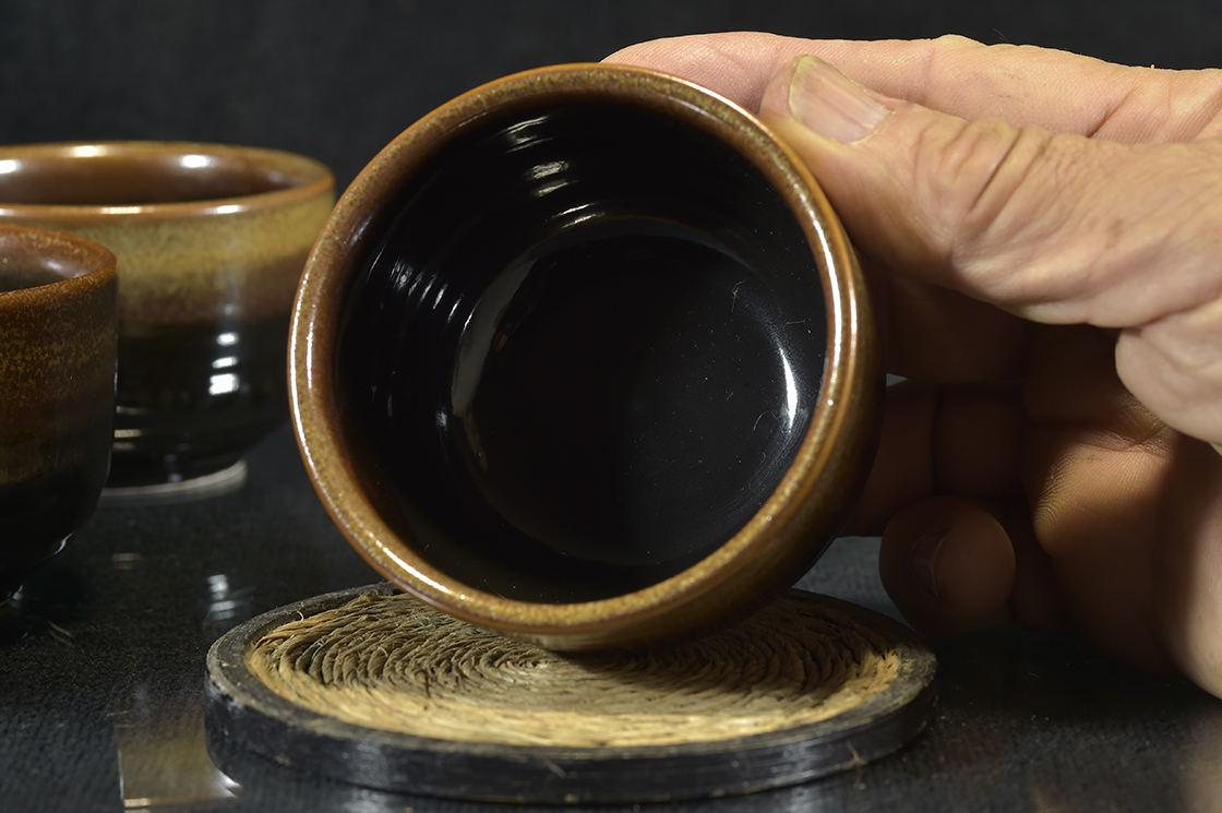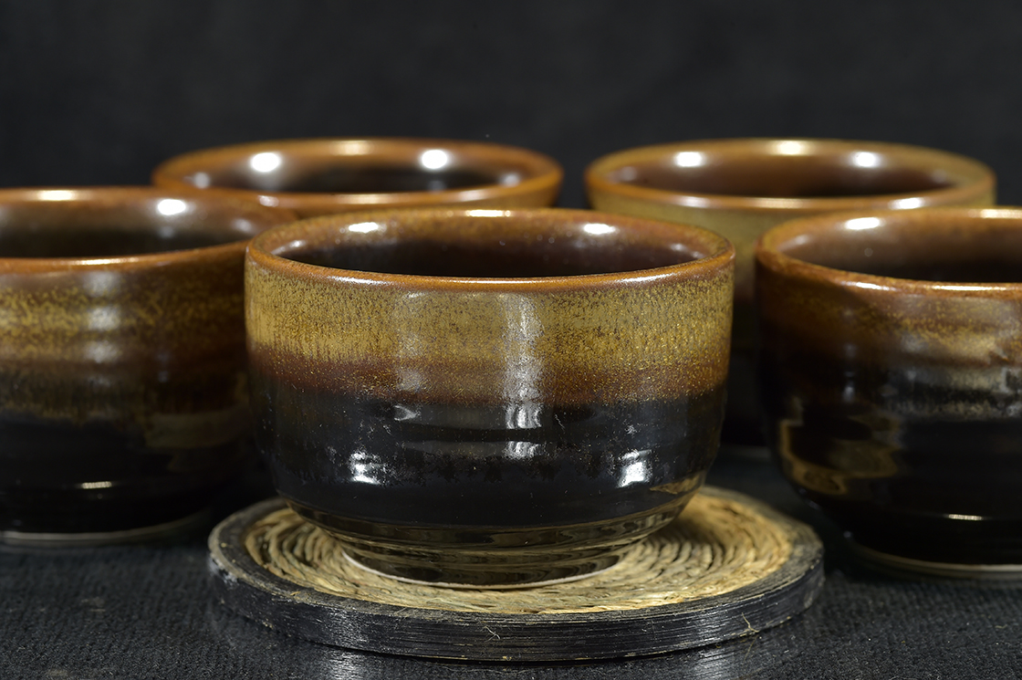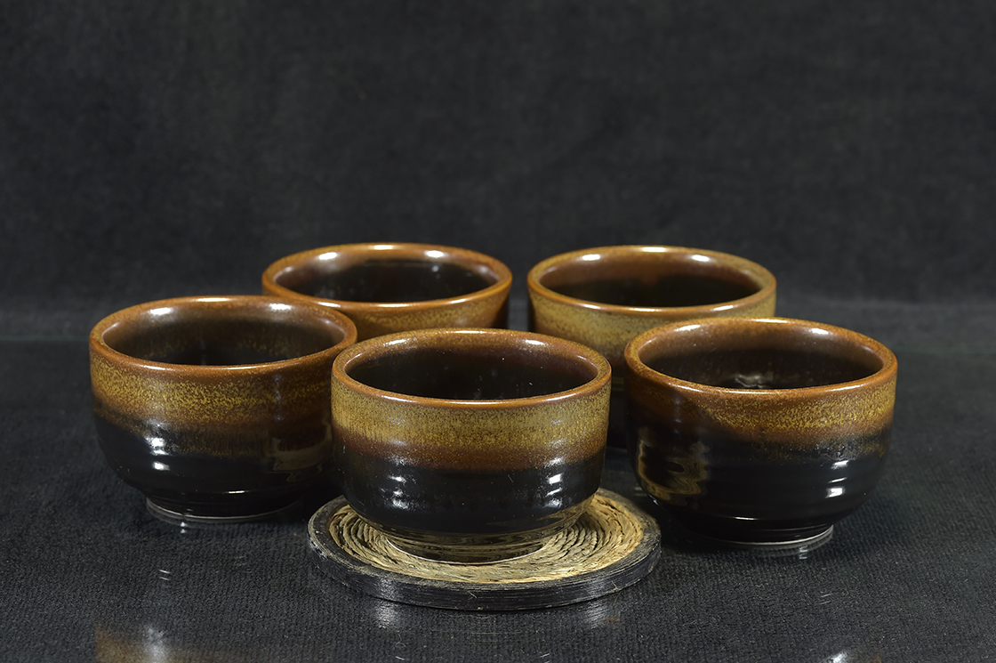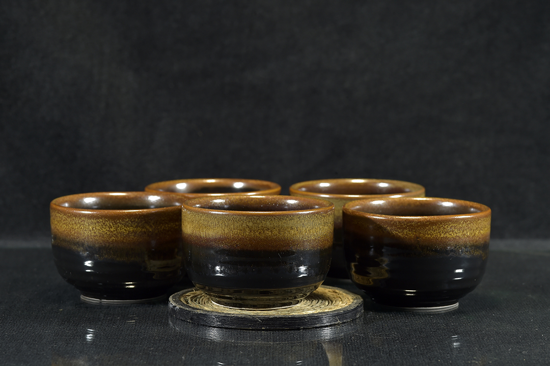 Tenmoku mázas teáscsésze készlet, ami öt csészéből áll. A csészék átmérője 8,2 cm, magassága 7 cm. Ezek a közepes-nagy méretű csészék alkalmazkodnak a legjobban bármilyen teához.